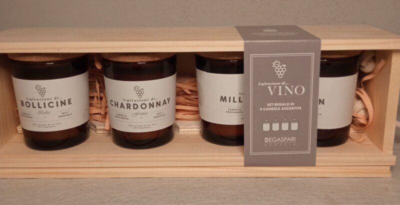 Confezione composta da 4 candele da 70 gr ciascuna, tappi in sughero e scatola in legno.