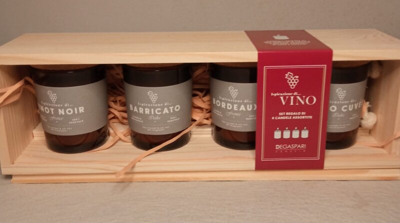 Confezione composta da 4 candele da 70 gr ciascuna, tappi in sughero e scatola in legno.