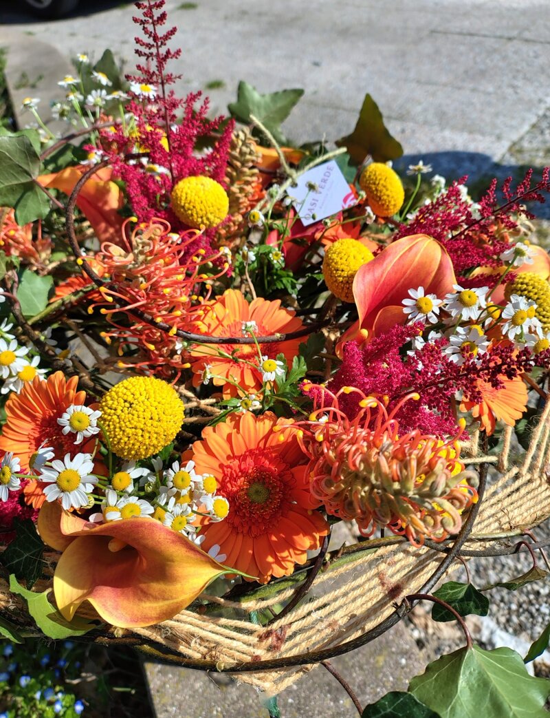 Mazzo di fiori sulla palette dell'arancione, giallo e bordeaux, creato su una struttura.