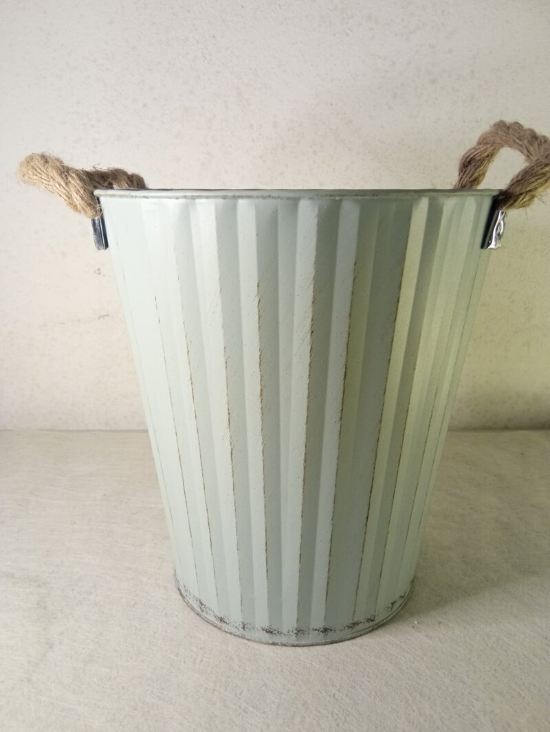 Vaso in latta, con righe verticali e manici in corda. Colore verde acqua.